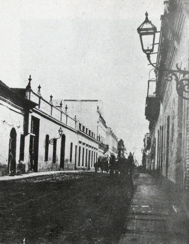 Piedad entre Florida y Maipú - 00/00/1878 - [655] - Orden: 8 Verdadero aspecto colonial de la calle Piedad (hoy Bartolomé Mitre) entre Florida y Maipú. Se destacan los faroles con iluminación a gas. En el fondo se observa levemente el campanario de la iglesia San Miguel que está en Bartolomé Mitre y Suipacha.