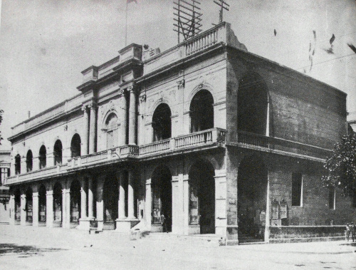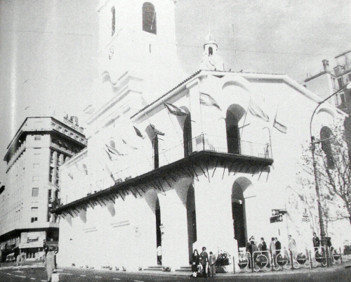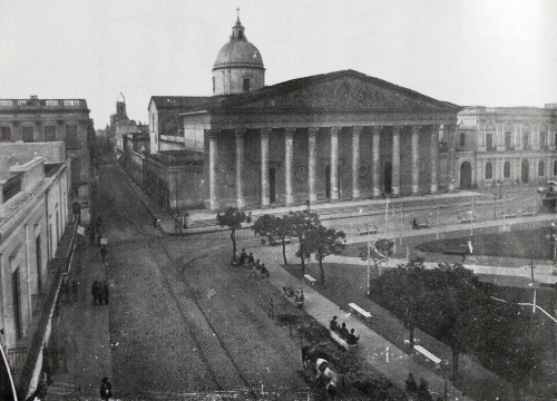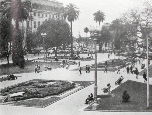 En la plaza se ven recién plantados los primeros paraísos. La manzana del edificio había sido de los Jesuitas. Se la expropiaron, indenmizaron y les dieron lo que luego sería la Manzana de las Luces.