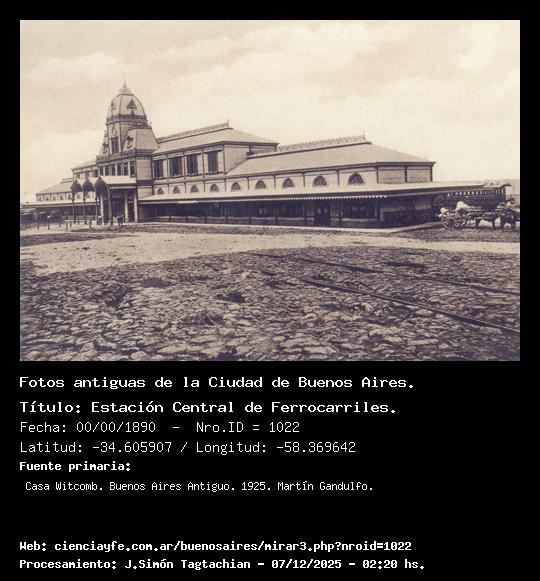 En tal virtud se construyó sobre el Paseo de Julio (hoy Leandro N. Alem), entre las calles Piedad y Cangallo, un edificio de madera con techo metálico que, después de 30 años de existencia, un incendio destruyó totalmente el 14 de febrero de 1897. Su desaparición impuso el cambio de cabecera para las dos líneas, estableciéndola, la del Norte, en el Retiro y la de la Ensenada, en Casa Amarilla, la que a su vez también dejó de serlo al refundirse la empresa en la del Sur. Fuente:Casa Witcomb. Buenos Aires Antiguo. 1925. Martín Gandulfo. Lat: -34.605907979019 - Long: -58.36964249610901 - Dirección: NE - Plano: 2 Palabras claves:Tren |
