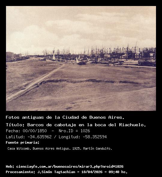 Con las obras llevadas a cabo bajo la direcció del ingenierio Luis Huergo, el Riachuelo mejoró sus condiciones y permitió fondear buques a vela y a vapor de ultramar, desde su desembocadura hasta el Puente de Barracas, en cuya orilla derecha, poco después, se construyó el Mercado Central de Frutos. Fuente:Casa Witcomb. Buenos Aires Antiguo. 1925. Martín Gandulfo. Lat: -34.6359621276002 - Long: -58.35259437561035 - Dirección: ZZ - Plano: 3 |