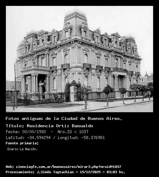 Residencia Ortiz Basualdo - 00/00/1930 - [Id: 1037] (Ver la Foto x 2) - (Ver la Foto x 3) - (Exportar foto) Emplazada en el extremo de una manzana irregular frente a la Plaza San Martín, delimitada por las calles Basavilbaso, Arenales y Maipú, fue construida por el arquitecto belga Julio Dormal y terminada en 1904. Ese año ganó el premio municipal a la mejor fachada.Su comitente fue la señora Magdalena Dorrego de Ortiz Basualdo, quien la encargó para sus hijos Inés y Carlos. La casa, que presentaba unidad compositiva en sus frentes, por dentro estaba dividida en dos áreas independientes para preservar la intimidad de cada grupo familiar.El complejo residencial fue demolido en dos etapas, en 1945 el sector sobre Arenales, y el resto en 1969. Fuente:Diario La Nación. Lat: -34.5942943678479 - Long: -58.37698112411499 - Dirección: NN - Plano: 1 Palabras claves:Residencia Ortiz Basualdo |