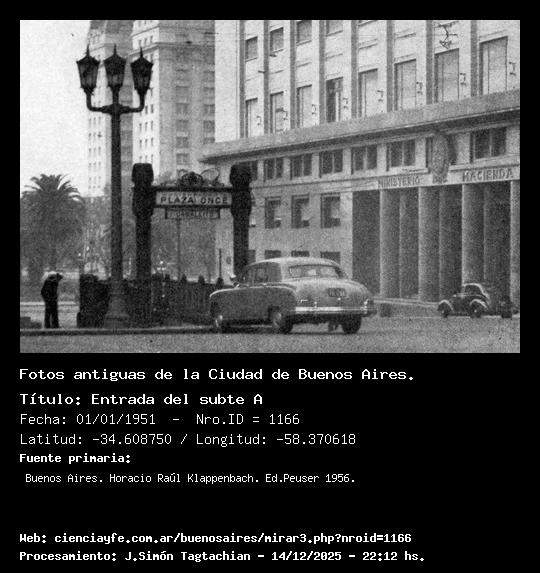 Entrada del subte A - 01/01/1951 - [Id: 1166] Fuente:Buenos Aires. Horacio Raúl Klappenbach. Ed.Peuser 1956. |