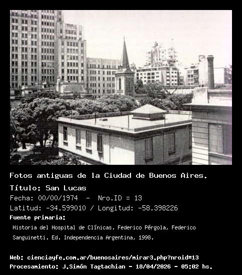 San Lucas - 00/00/1974 - [Id: 13] Fuente:Historia del Hospital de Clínicas. Federico Pérgola, Federico Sanguinetti. Ed. Independencia Argentina, 1998. Palabras claves:Iglesia San Lucas, Hospital de Clínicas; Plaza Houssay |