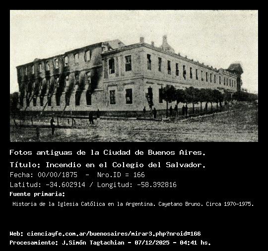 Incendio en el Colegio del Salvador. - 00/00/1875 - [Id: 166] Fuente:Historia de la Iglesia Católica en la Argentina. Cayetano Bruno. Circa 1970-1975. |