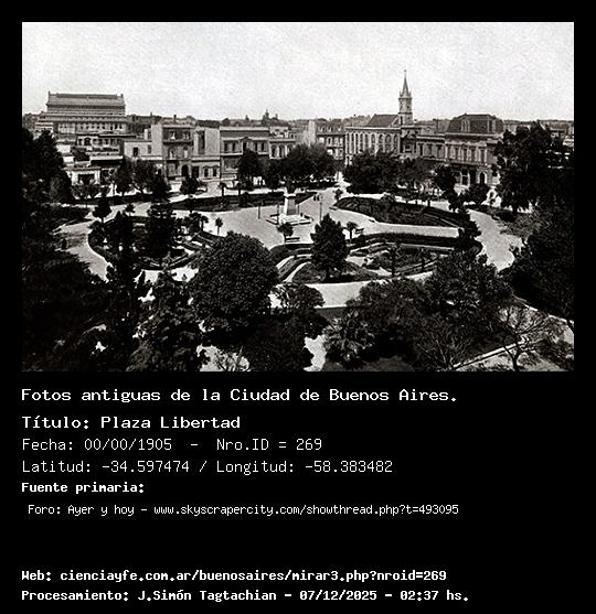 Plaza Libertad - 00/00/1905 - [Id: 269] Fuente:Foro: Ayer y hoy - www.skyscrapercity.com/showthread.php?t=493095 Palabras claves:Plaza Libertad, Iglesia Las Victorias, Teatro Colón |
