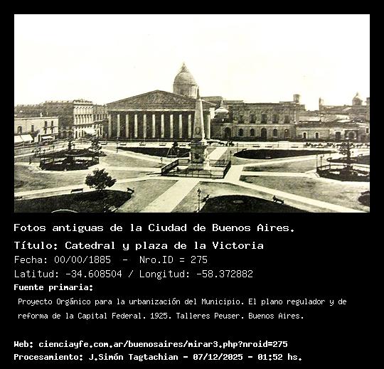 Catedral y plaza de la Victoria - 00/00/1885 - [Id: 275] Fuente:Proyecto Orgánico para la urbanización del Municipio. El plano regulador y de reforma de la Capital Federal. 1925. Talleres Peuser. Buenos Aires. Palabras claves:Pirámide de mayo |
