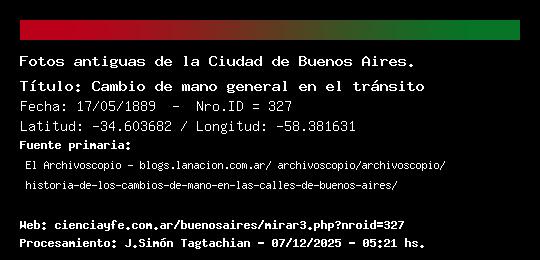 Cambio de mano general en el tránsito - 17/05/1889 - [Id: 327] Fuente:El Archivoscopio - blogs.lanacion.com.ar/ archivoscopio/archivoscopio/ historia-de-los-cambios-de-mano-en-las-calles-de-buenos-aires/ |