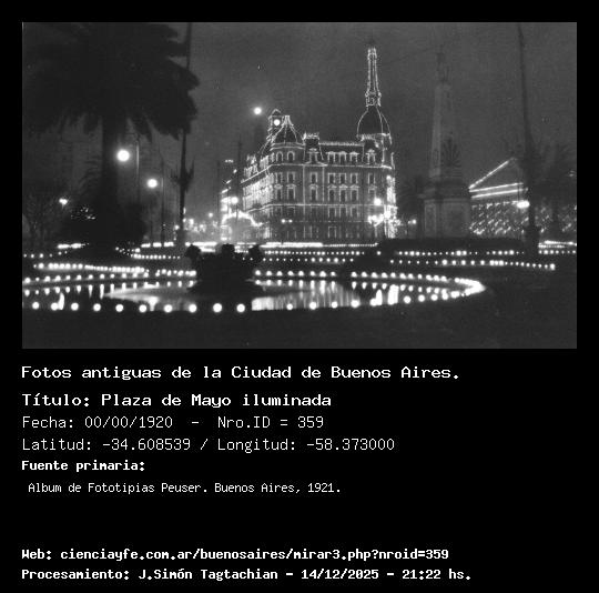 Plaza de Mayo iluminada - 00/00/1920 - [Id: 359] Fuente:Album de Fototipias Peuser. Buenos Aires, 1921. |