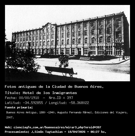 Hotel de los Inmigrantes - 00/00/1910 - [Id: 397] Fuente:Buenos Aires Antiguo. 1880 -1940. Augusto Fernando Mármol. Ediciones del Viajero, 2007. |