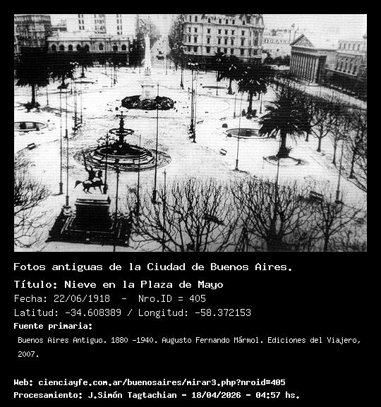 Nieve en la Plaza de Mayo - 22/06/1918 - [Id: 405] Fuente:Buenos Aires Antiguo. 1880 -1940. Augusto Fernando Mármol. Ediciones del Viajero, 2007. |