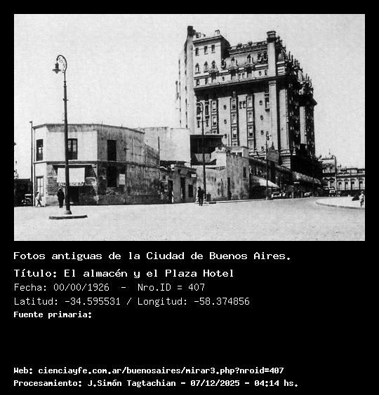 El almacén y el Plaza Hotel - 00/00/1926 - [Id: 407] Fuente: |