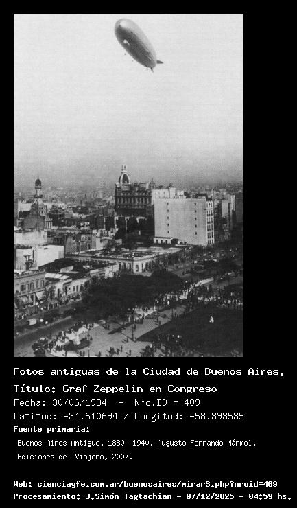 Graf Zeppelin en Congreso - 30/06/1934 - [Id: 409] Fuente:Buenos Aires Antiguo. 1880 -1940. Augusto Fernando Mármol. Ediciones del Viajero, 2007. Palabras claves:dirigible |