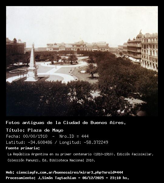 Plaza de Mayo - 00/00/1910 - [Id: 444] Fuente:La República Argentina en su primer centenario (1810-1910). Edición facisimilar, Colección Panunzi. Ed. Biblioteca Nacional 2010. Palabras claves:Casa Rosada |