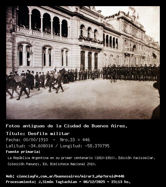 Desfile militar - 00/00/1910 - [Id: 446] Fuente:La República Argentina en su primer centenario (1810-1910). Edición facisimilar, Colección Panunzi. Ed. Biblioteca Nacional 2010. Palabras claves:Casa Rosada |