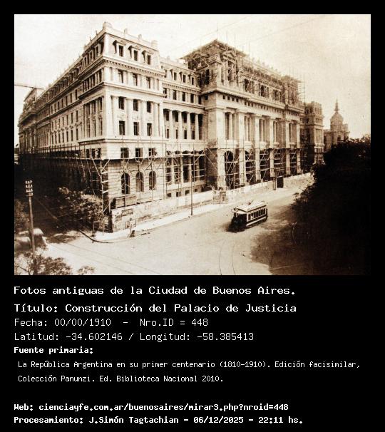 Construcción del Palacio de Justicia - 00/00/1910 - [Id: 448] Fuente:La República Argentina en su primer centenario (1810-1910). Edición facisimilar, Colección Panunzi. Ed. Biblioteca Nacional 2010. Palabras claves:Palacio de Tribunales |