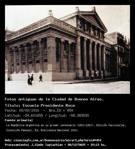 Escuela Presidente Roca - 00/00/1910 - [Id: 454] Fuente:La República Argentina en su primer centenario (1810-1910). Edición facisimilar, Colección Panunzi. Ed. Biblioteca Nacional 2010. Palabras claves:Escuela |
