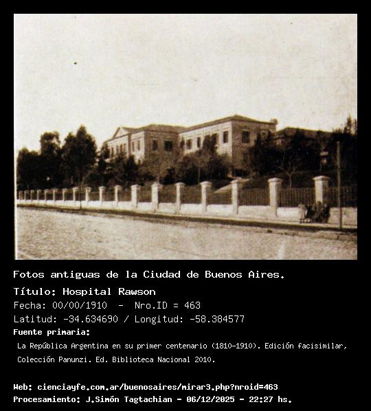 Hospital Rawson - 00/00/1910 - [Id: 463] Fuente:La República Argentina en su primer centenario (1810-1910). Edición facisimilar, Colección Panunzi. Ed. Biblioteca Nacional 2010. Palabras claves:Hospital Rawson |
