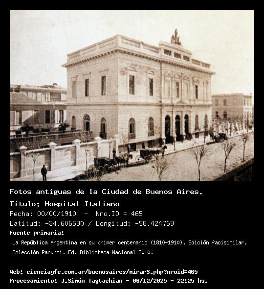 Hospital Italiano - 00/00/1910 - [Id: 465] Fuente:La República Argentina en su primer centenario (1810-1910). Edición facisimilar, Colección Panunzi. Ed. Biblioteca Nacional 2010. Palabras claves:Hospital Italiano |
