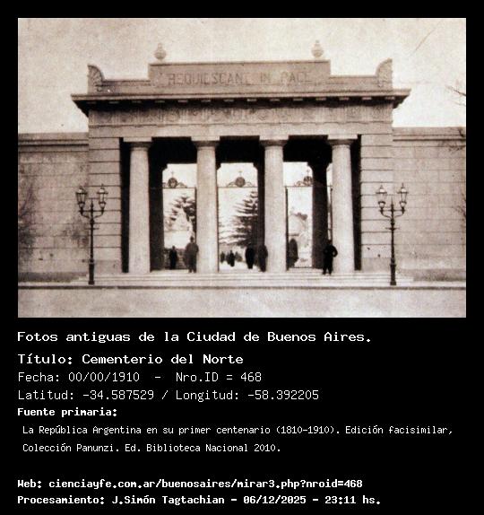Cementerio del Norte - 00/00/1910 - [Id: 468] Fuente:La República Argentina en su primer centenario (1810-1910). Edición facisimilar, Colección Panunzi. Ed. Biblioteca Nacional 2010. Palabras claves:Cementerio de la Recoleta |
