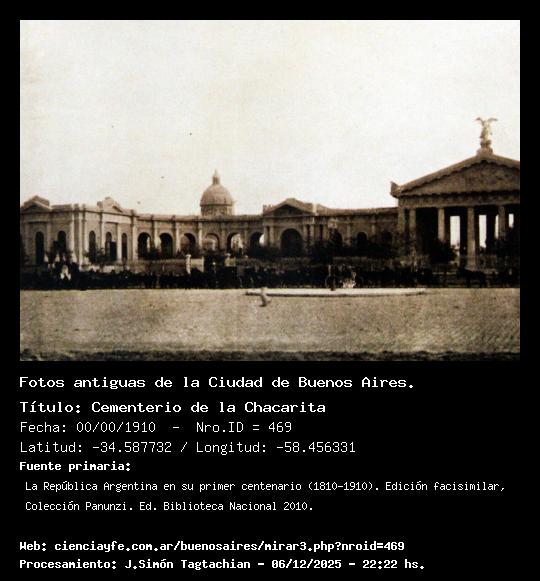 Cementerio de la Chacarita - 00/00/1910 - [Id: 469] Fuente:La República Argentina en su primer centenario (1810-1910). Edición facisimilar, Colección Panunzi. Ed. Biblioteca Nacional 2010. Palabras claves:Cementerio de la Chacarita |