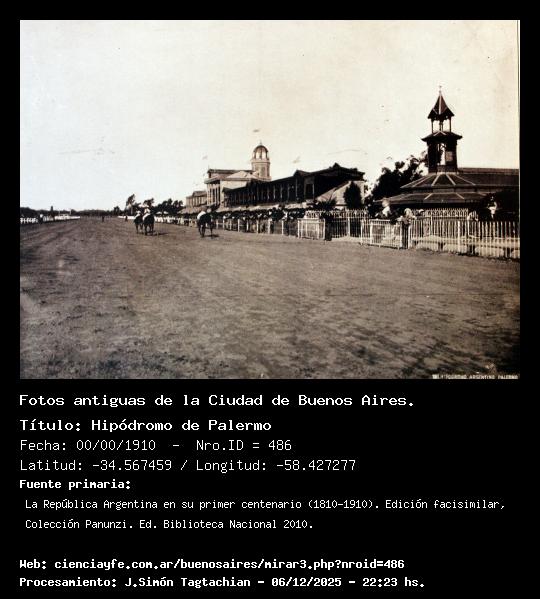 Hipódromo de Palermo - 00/00/1910 - [Id: 486] Fuente:La República Argentina en su primer centenario (1810-1910). Edición facisimilar, Colección Panunzi. Ed. Biblioteca Nacional 2010. |
