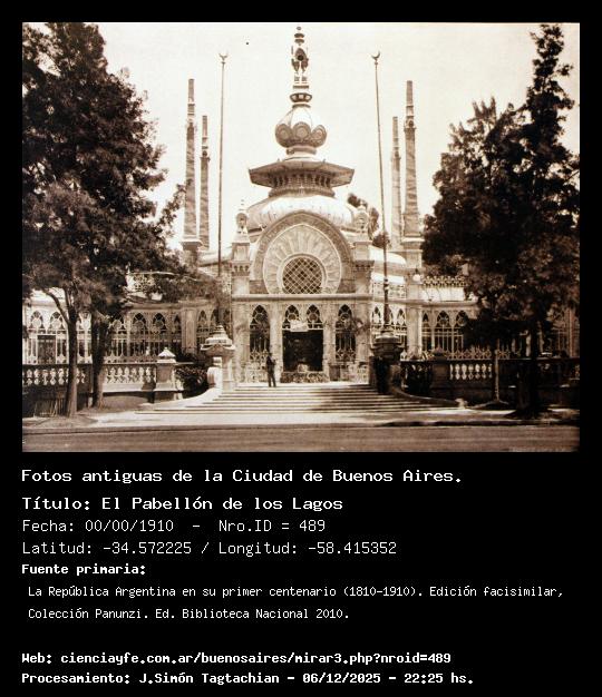 El Pabellón de los Lagos - 00/00/1910 - [Id: 489] Fuente:La República Argentina en su primer centenario (1810-1910). Edición facisimilar, Colección Panunzi. Ed. Biblioteca Nacional 2010. Palabras claves:Rosedal |