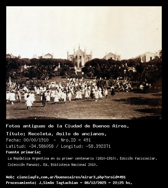 Recoleta. Asilo de ancianos. - 00/00/1910 - [Id: 491] Fuente:La República Argentina en su primer centenario (1810-1910). Edición facisimilar, Colección Panunzi. Ed. Biblioteca Nacional 2010. |