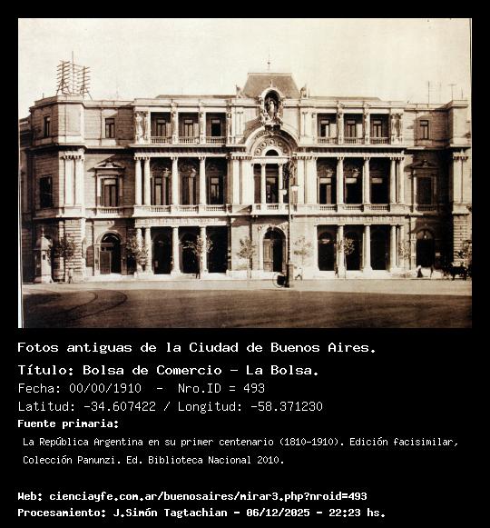 Bolsa de Comercio - La Bolsa. - 00/00/1910 - [Id: 493] Fuente:La República Argentina en su primer centenario (1810-1910). Edición facisimilar, Colección Panunzi. Ed. Biblioteca Nacional 2010. |