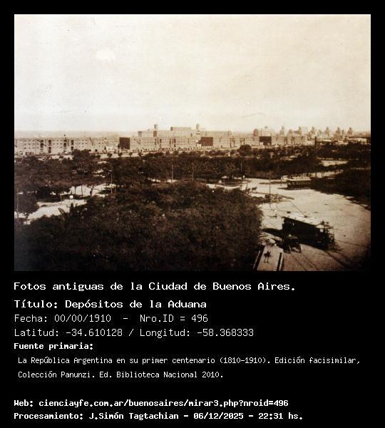 Depósitos de la Aduana - 00/00/1910 - [Id: 496] Fuente:La República Argentina en su primer centenario (1810-1910). Edición facisimilar, Colección Panunzi. Ed. Biblioteca Nacional 2010. |
