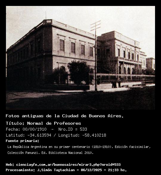 Normal de Profesores - 00/00/1910 - [Id: 533] Fuente:La República Argentina en su primer centenario (1810-1910). Edición facisimilar, Colección Panunzi. Ed. Biblioteca Nacional 2010. Palabras claves:Escuela Mariano Acosta |