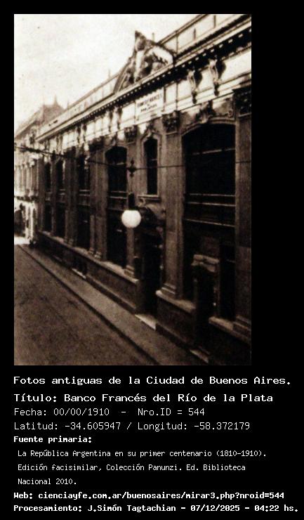 Banco Francés del Río de la Plata - 00/00/1910 - [Id: 544] Fuente:La República Argentina en su primer centenario (1810-1910). Edición facisimilar, Colección Panunzi. Ed. Biblioteca Nacional 2010. |
