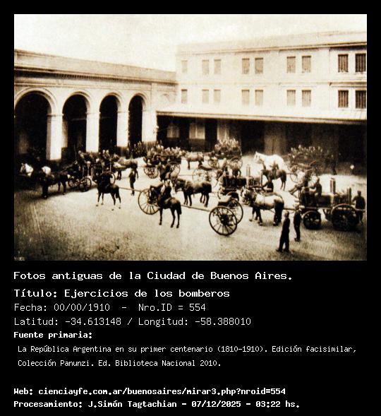 Ejercicios de los bomberos - 00/00/1910 - [Id: 554] Fuente:La República Argentina en su primer centenario (1810-1910). Edición facisimilar, Colección Panunzi. Ed. Biblioteca Nacional 2010. |