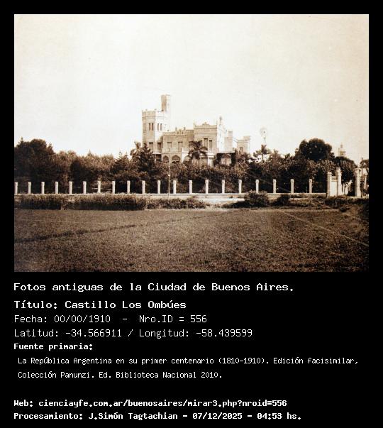 Confrontar: coronasreales.foroargentina.net/t1410-castillo-los-ombues-caba Fuente:La República Argentina en su primer centenario (1810-1910). Edición facisimilar, Colección Panunzi. Ed. Biblioteca Nacional 2010. Lat: -34.5669114335191 - Long: -58.4395998716354 - Dirección: SO - Plano: 0 Palabras claves:Belgrano Castillo |