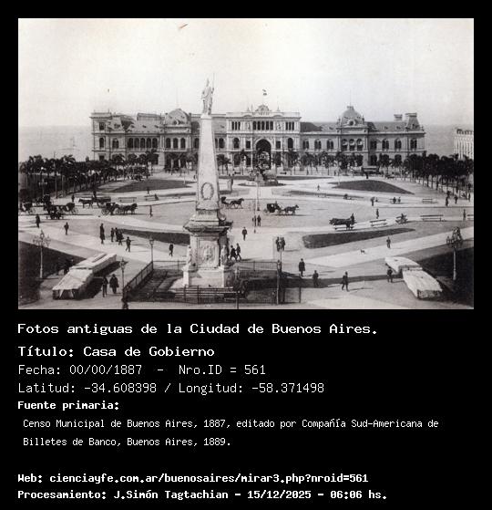 Casa de Gobierno - 00/00/1887 - [Id: 561] Fuente:Censo Municipal de Buenos Aires, 1887, editado por Compañía Sud-Americana de Billetes de Banco, Buenos Aires, 1889. Palabras claves:Plaza de la Victoria. Plaza de Mayo. |