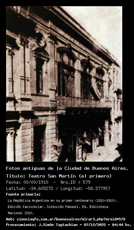 Teatro San Martín (el primero) - 00/00/1910 - [Id: 579] (Fuente de la información: La fotografía en la historia argentina, Buenos Aires, AGEA, 2005). Fuente:La República Argentina en su primer centenario (1810-1910). Edición facisimilar, Colección Panunzi. Ed. Biblioteca Nacional 2010. Palabras claves:Teatro |