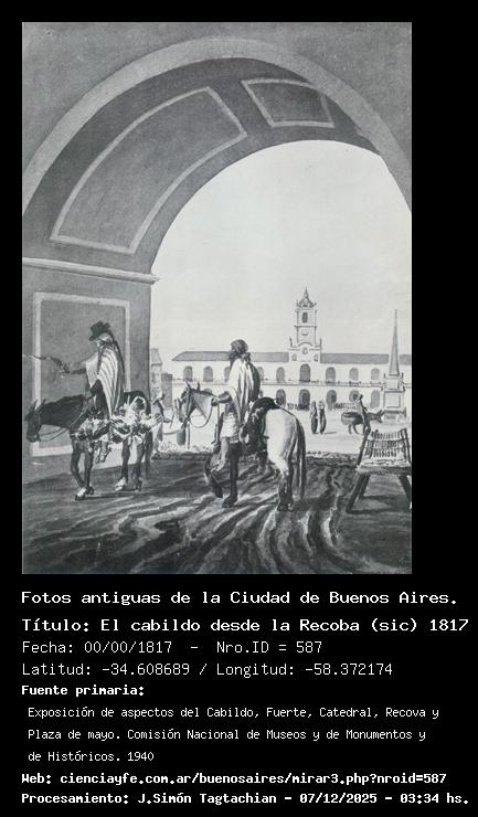 El cabildo desde la Recoba (sic) 1817 - 00/00/1817 - [Id: 587] Fuente:Exposición de aspectos del Cabildo, Fuerte, Catedral, Recova y Plaza de mayo. Comisión Nacional de Museos y de Monumentos y de Históricos. 1940 Palabras claves:Recova |