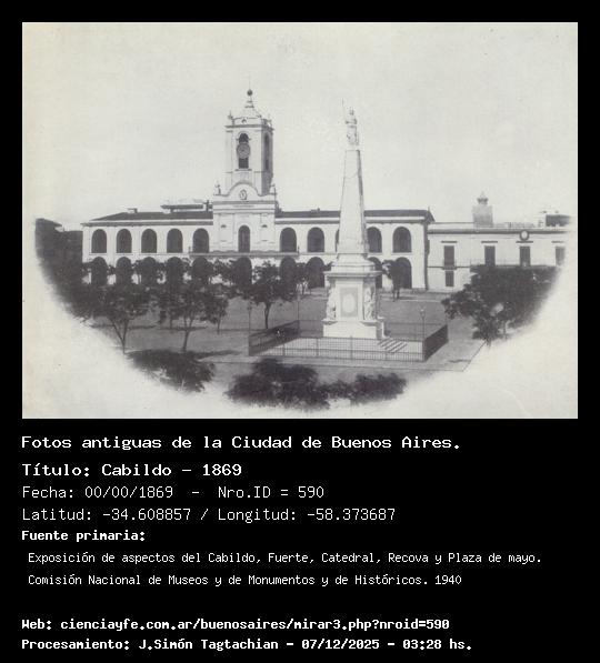Cabildo - 1869 - 00/00/1869 - [Id: 590] Fuente:Exposición de aspectos del Cabildo, Fuerte, Catedral, Recova y Plaza de mayo. Comisión Nacional de Museos y de Monumentos y de Históricos. 1940 Palabras claves:Pintura, Plaza de Mayo |