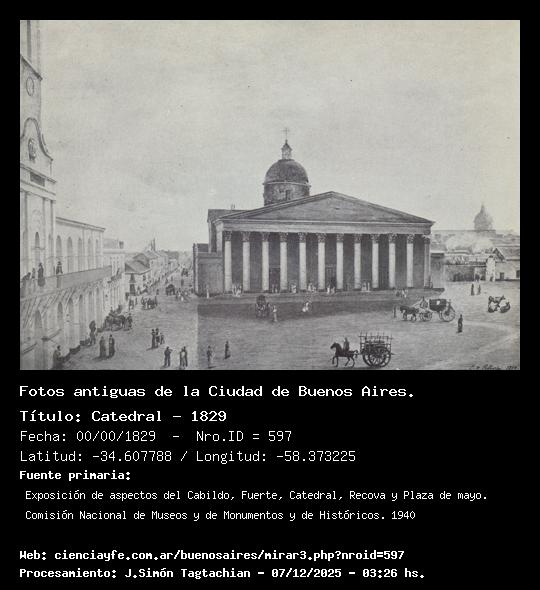 Catedral - 1829 - 00/00/1829 - [Id: 597] Fuente:Exposición de aspectos del Cabildo, Fuerte, Catedral, Recova y Plaza de mayo. Comisión Nacional de Museos y de Monumentos y de Históricos. 1940 Palabras claves:Plaza de Mayo, Cabildo, Pintura |