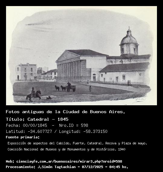 Catedral - 1845 - 00/00/1845 - [Id: 598] Fuente:Exposición de aspectos del Cabildo, Fuerte, Catedral, Recova y Plaza de mayo. Comisión Nacional de Museos y de Monumentos y de Históricos. 1940 Palabras claves:Pintura |