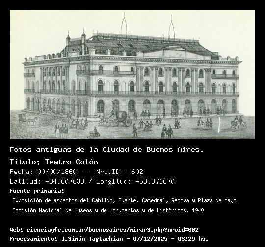 Teatro Colón - 00/00/1860 - [Id: 602] Fuente:Exposición de aspectos del Cabildo, Fuerte, Catedral, Recova y Plaza de mayo. Comisión Nacional de Museos y de Monumentos y de Históricos. 1940 Palabras claves:Plaza de Mayo |