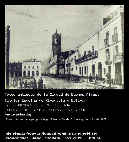 Esquina de Rivadavia y Bolívar - 00/00/1830 - [Id: 634] (Ver la Foto x 2) - (Ver la Foto x 3) - (Exportar foto) En primer plano, a la derecha, se observa 'los Altos de Urioste'(demolido en 1913 para abrir Diagonal Norte), primera casa de tres pisos edificada en Buenos Aires. Como el piso intermedio era más bajo, se la conocía como la casa 'de los dos pisos y medio'. A su lado, la finca de Bolivar 11, fue adquirida por el Gobierno para ser obsequiada al Gral San Martín por sus triunfos en Chacabuco y Maipú. Cuando San Martín se fue del País, don Manuel de Escalada vendió la propiedad a don Miguel Riglos. El balcón de esta casa fue famoso por sus festejos. Se la conocía como 'los Altos de Riglos'. Siguiendo hacia el sur, medianera por medio, estaba el Departamento de Policía (demolido en 1889 para abrir Avda de Mayo), y luego el Cabildo. Pasando el Cabildo, sobre mano izquierda, se observa el mirador de 'los altos de Crisol'. Y también -en primer plano- la verja de la Catedral para protejerla de los Caballos. Fuente:Buenos Aires de ayer y de hoy. Roberto Conde.Ed corregidor. Conde 1982. Lat: -34.6079566684676 - Long: -58.3735585212708 - Dirección: SS - Plano: 2 Palabras claves:Pintura |