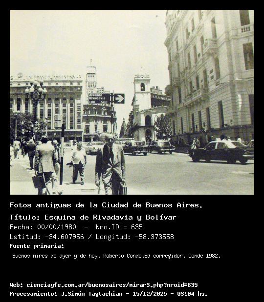 Esquina de Rivadavia y Bolívar - 00/00/1980 - [Id: 635] Fuente:Buenos Aires de ayer y de hoy. Roberto Conde.Ed corregidor. Conde 1982. Palabras claves:City Hotel, franco argentina, cabildo |