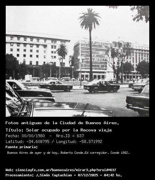 Solar ocupado por la Recova vieja - 00/00/1980 - [Id: 637] Fuente:Buenos Aires de ayer y de hoy. Roberto Conde.Ed corregidor. Conde 1982. Palabras claves:Plaza de Mayo. |