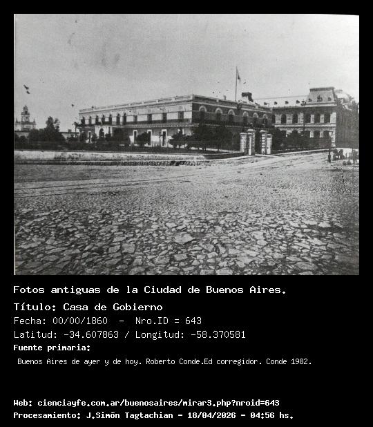 Casa de Gobierno - 00/00/1860 - [Id: 643] (Ver la Foto x 2) - (Ver la Foto x 3) - (Exportar foto) En el centro se destaca la Casa de Gobierno, última fracción del fuerte y que fuera ocupada por Nicolás Avellaneda desde 1874 hasta 1880. La torre que se ve sobre la izuierda corresponde a la Aduana nueva (Plaza Colón). Desde 1899 los tranvías funcionan con caballos. La calle estaba empedrada y la plaza tenía adoquines. Julio Roca asume en 1882 y resuelve la demolición de la vieja casa y construyen una similar a la Casa de Correos. Luego se unieron las casas con la construcción de un cuerpo central, a cargo del arq. Francisco Tamburini. Fuente:Buenos Aires de ayer y de hoy. Roberto Conde.Ed corregidor. Conde 1982. Lat: -34.607863948701 - Long: -58.37058126926421 - Dirección: SE - Plano: 2 Palabras claves:Casa Rosada |