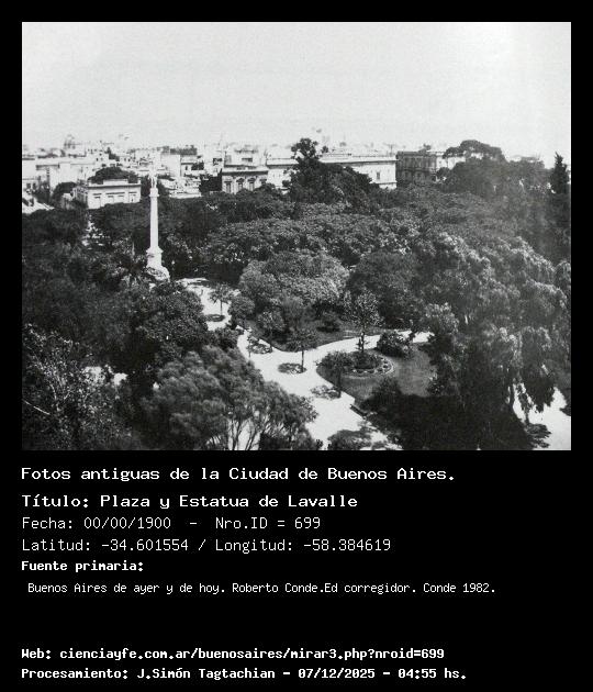 Plaza y Estatua de Lavalle - 00/00/1900 - [Id: 699] Fuente:Buenos Aires de ayer y de hoy. Roberto Conde.Ed corregidor. Conde 1982. Palabras claves:Plaza Lavalle |