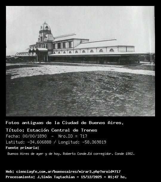 Estación Central de Trenes - 00/00/1890 - [Id: 717] (Ver la Foto x 2) - (Ver la Foto x 3) - (Exportar foto) Las autoridades del Ferrocarril del Norte al ver que el tráfico de pasajeros aumentaba enormement y considerando que el servicio de tranvías era insuficiente solicitaron el permiso para prolongar la línea hasta Paseo Colón (hoy L.N. Alem) y Piedad (Bartolomé Mitre) donde se construyó la nueva terminal llamada Estación Central. A esta llegaron los trenes del norte y del sur. Los del norte corrían por LN Alem entre unas verjas de hierro con pocas barreras. La estación se quemó el 14 de febrero de 1897. El gobierno no autorizó su reconstrucción y Retiro volvió a ser la cabecera. Se originó un pleito hasta 1933 (y en un momento hubo allí un galpón de ferrocarriles - se levantó todo, verja, galpón y rieles). Fuente:Buenos Aires de ayer y de hoy. Roberto Conde.Ed corregidor. Conde 1982. Lat: -34.6068881772601 - Long: -58.369819521904 - Dirección: NE - Plano: 2 |