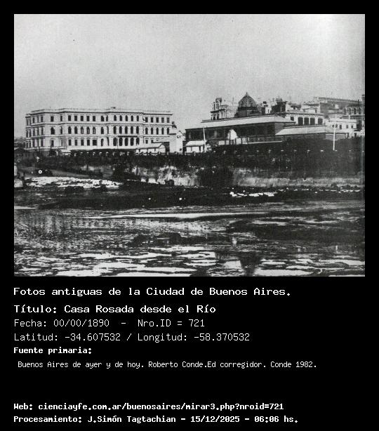 Casa Rosada desde el Río - 00/00/1890 - [Id: 721] (Ver la Foto x 2) - (Ver la Foto x 3) - (Exportar foto) Fecha aproximadas. Se destaca la Casa de Gobierno cuando todavía faltaba el contrafrente (ver fecha), se ve la Estación Central de Trenes, y la Bajada que usaban los carros para llegar al Río. Es destacable el Muro de la Alameda, con verja de hierro que por orden de Rosas se construyera en 1846. Este muro llegaba hasta Corrientes, cuya piedra fundamental fue colocada el 18/ene/1847. Cuando se construyó Puerto Madero, se rellenó y hoy se cuenta con una amplia avenida con estacionamientos subterráneos. Fuente:Buenos Aires de ayer y de hoy. Roberto Conde.Ed corregidor. Conde 1982. Lat: -34.6075328058323 - Long: -58.370532989501996 - Dirección: SE - Plano: 2 |