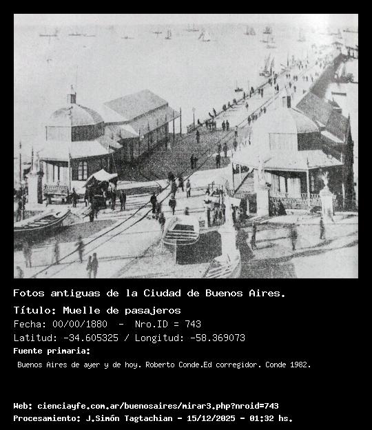 Muelle de pasajeros - 00/00/1880 - [Id: 743] (Ver la Foto x 2) - (Ver la Foto x 3) - (Exportar foto) Fecha aproximada. El Muelle de pasajeros data del 1ro de febrero de 1855. En su entrada se habían construido dos casillas de madera y dependencias donder eran conducidos los pasajeros y revisado su equipaje, que se traian en vagones los cuales circulaban por unos rieles que se encontraban en el centro del muelle. Existió hasta comienzos de 1899. Lo que fuera río, dejo de serlo a fines de 1884 cuando Roca firmó con Eduardo Madero la construcción del nuevo puerto. Alli quedó sepultado el Muro de la Alameda. Fuente:Buenos Aires de ayer y de hoy. Roberto Conde.Ed corregidor. Conde 1982. Lat: -34.6053251529578 - Long: -58.369073867797894 - Dirección: EE - Plano: 0 |