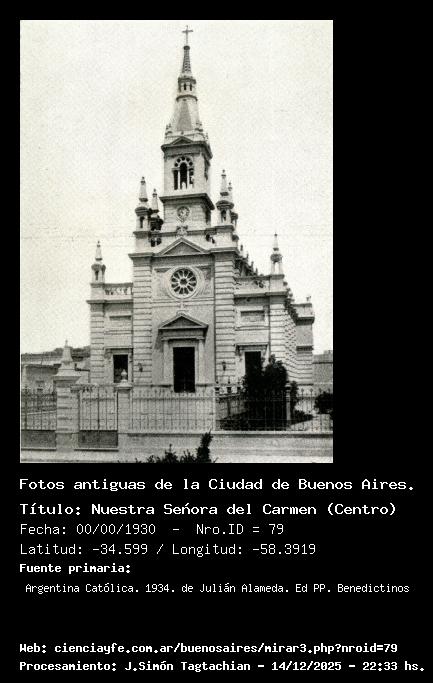 Nuestra Señora del Carmen (Centro) - 00/00/1930 - [Id: 79] Fuente:Argentina Católica. 1934. de Julián Alameda. Ed PP. Benedictinos Palabras claves:Iglesia Nuestra Señora del Carmen (Centro) |