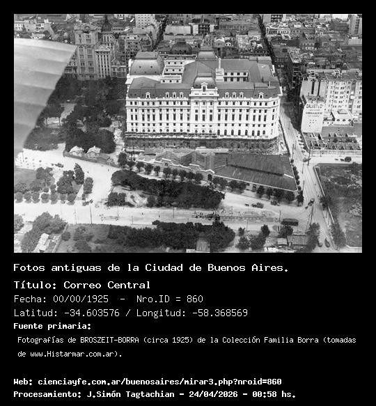 Correo Central - 00/00/1925 - [Id: 860] Fuente:Fotografías de BROSZEIT-BORRA (circa 1925) de la Colección Familia Borra (tomadas de www.Histarmar.com.ar). |